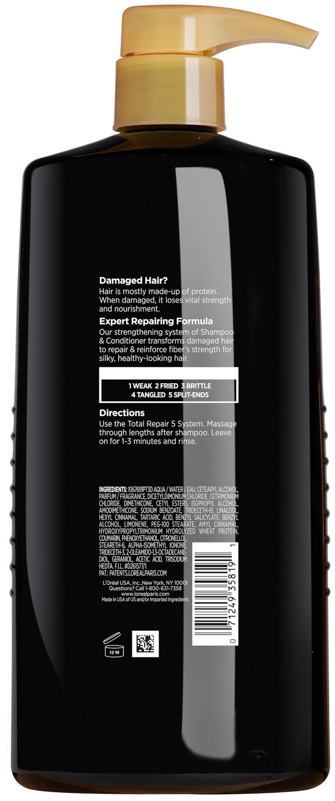 Details: L’Oreal Paris Total Repair 5 conditioner helps repair the five visible signs of damaged hair. The results? 1) Rebuilt fibers 2) Strength 3) Vitality 4) Silkiness and 5) Shine. Our strengthening system conditions with Protein + Ceramide and helps fortify each strand, reinforcing hair fiber and sealing-in nourishment. For best results, use L’Oreal Paris Total Repair 5 shampoo and conditioner together.